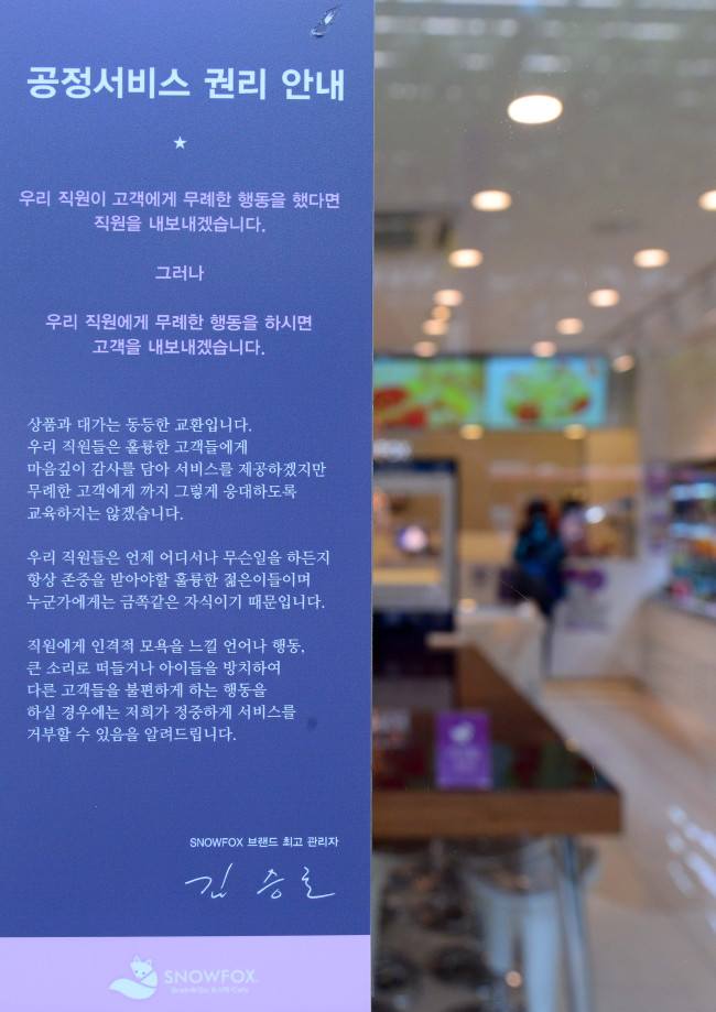 2015년 이러한 내용의 공지문을 매장에 붙여 당시 화제를 모았다. 바로 이 업체의 '공정서비스 권리 안내문' 중 한 구절이다. 그 안내문에는 "상품과 대가는 동등한 교환입니다. 우리 직원들은 훌륭한 고객들에게 마음깊이 감사를 담아 서비스를 제공하겠지만 무례한 고객에게까지 그렇게 응대하도록 교육하지는 않겠습니다"라고 설명되어있다.